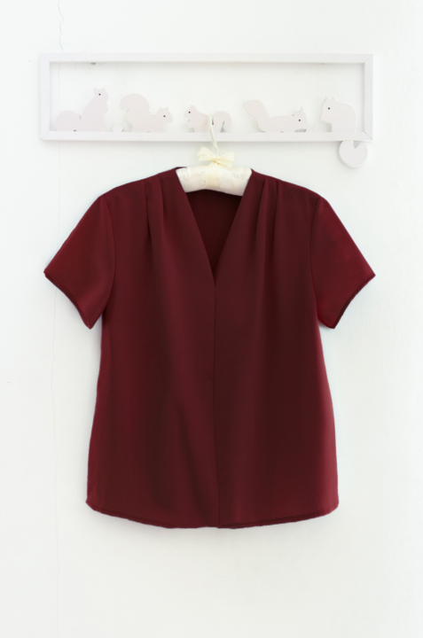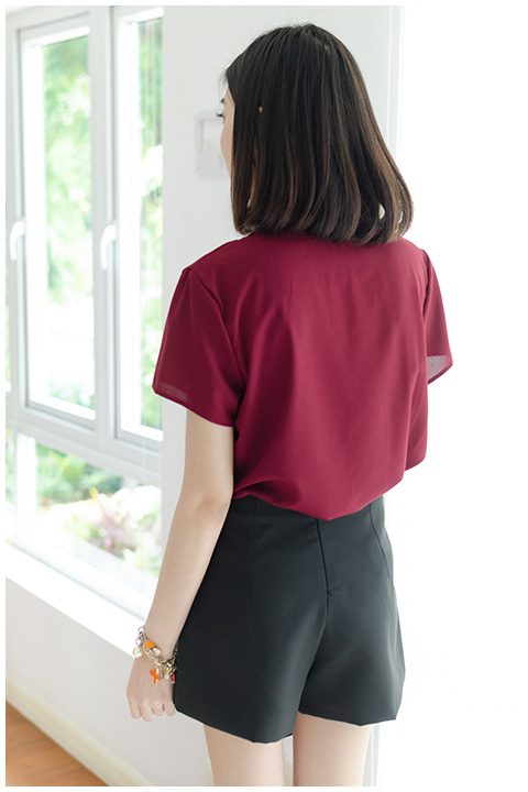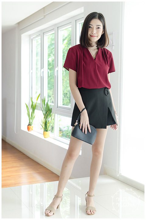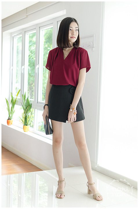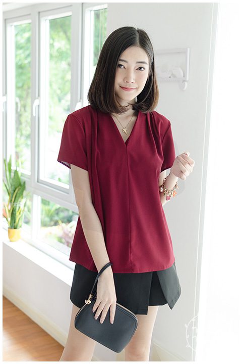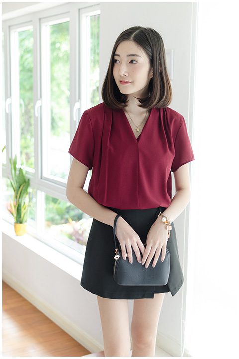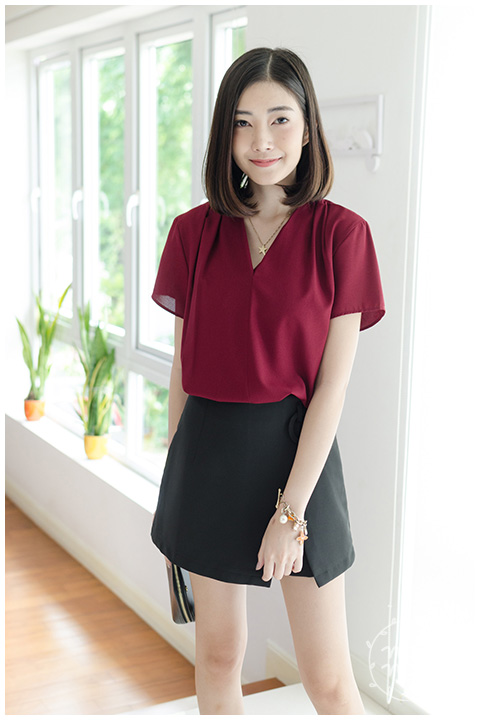 เสื้อทำงานคอวี ดีไซน์สวย เป็นคอวีป้ายซ้อนกันนิดๆ ด้านหน้า ไหล่จับจีบเบาๆ แขนสั้น ใช้ผ้าเนื้อดี ดูเรียบร้อย สวยแบบมีคลาสค่า