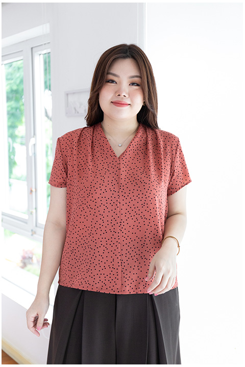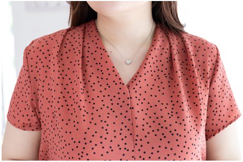 เสื้อคอวี ผ้าโพลีเอสเตอร์ผสมลายจุด ดีไซน์สวย เป็นคอวีป้ายซ้อนกันนิดๆ ด้านหน้า ไหล่จับจีบเบาๆ แขนทรงสั้น ใช้ผ้าเนื้อดี ดูเรียบร้อย สวยแบบมีคลาสค่า
