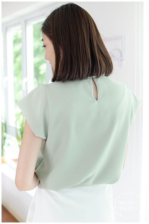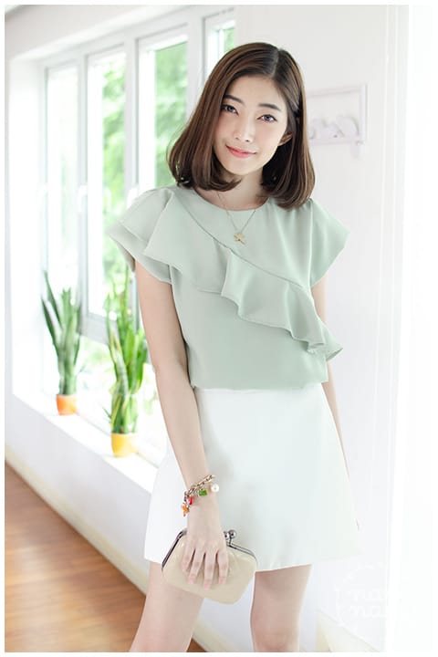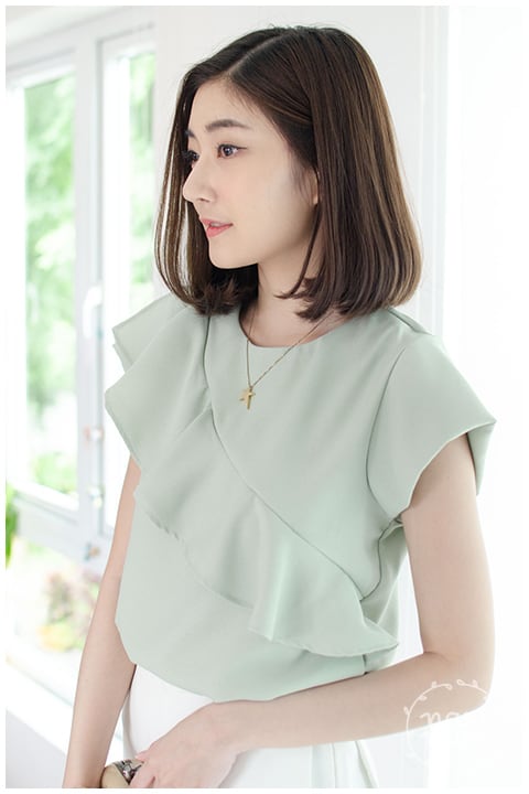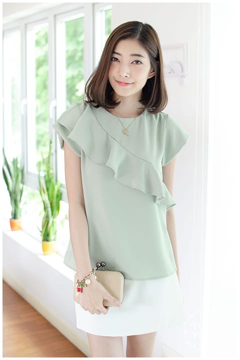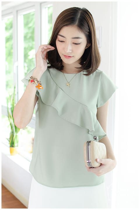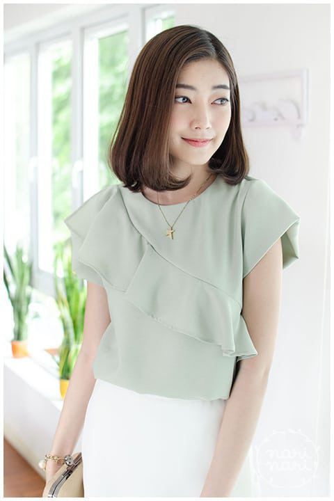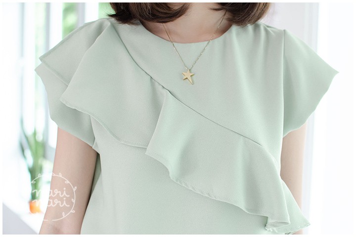 เสื้อคอกลม แขนสั้นทรง cap แต่งระบายพลิ้วเฉียงจากไหล่ขวาลงด้านซ้าย ตัดเย็บด้วยผ้าโพลีเอสเตอร์ผสมเนื้อสวยมาก เนื้อนิ่มมี Texture ในตัว สีเขียวพาสเทลสวยมาก ด้านหลังเจาะหยดน้ำ ติดกระดุม ใส่สบาย ทรงสวยค่ะ