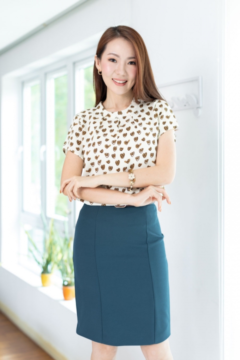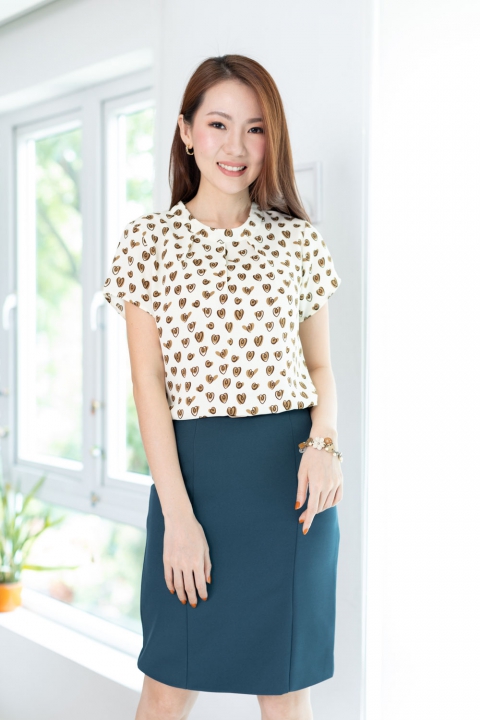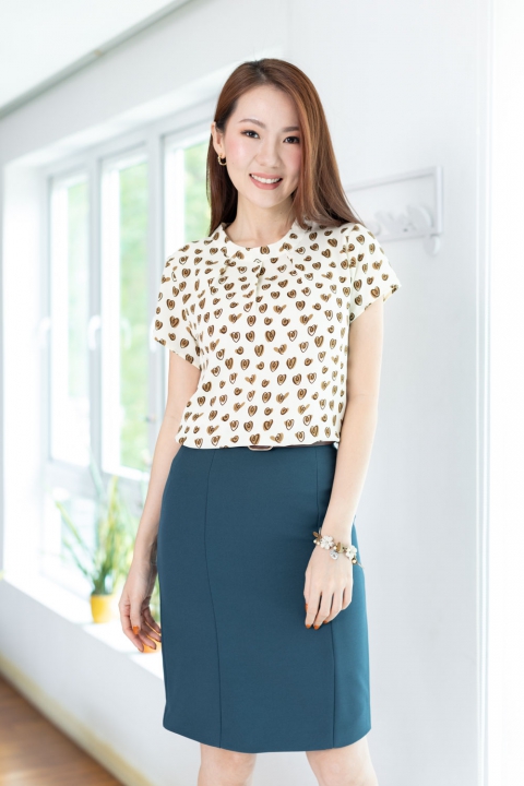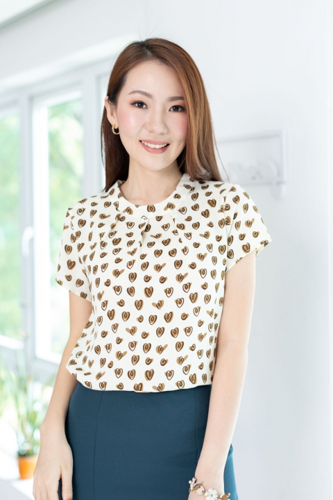 เสื้อแขนสั้นคอกลม จับจีบช่วงคอเบาๆ เนื้อผ้าโพลีเอสเตอร์ผสม พิมพ์ลายหัวใจ ด้านหลังผ่าซิปซ่อน ใส่ไปทำงานได้ สวยเรียบร้อย ดูดี ใส่ได้ไม่เบื่อเลย