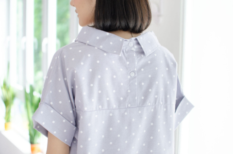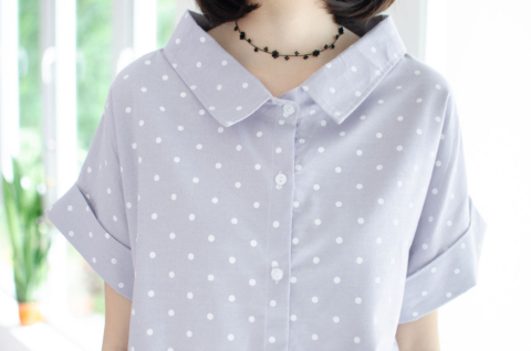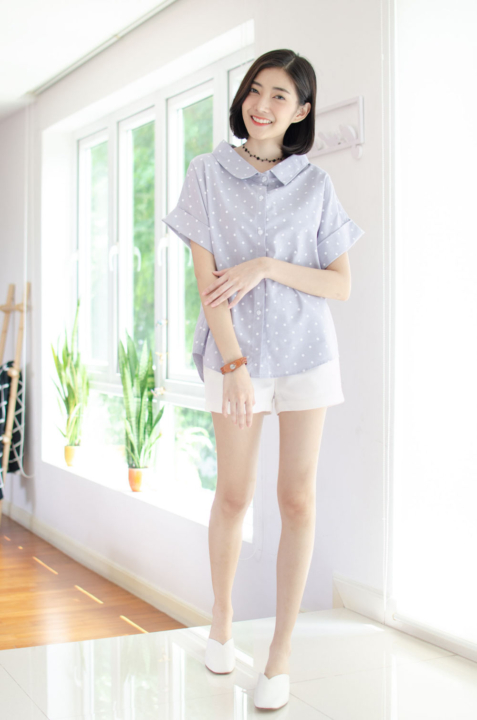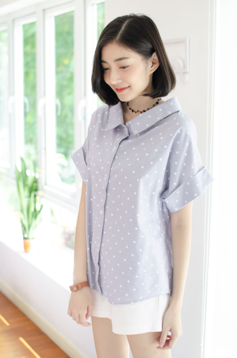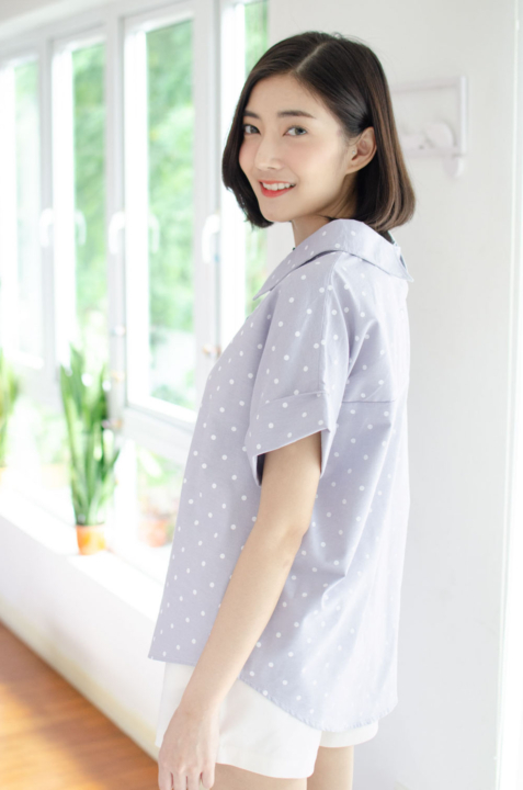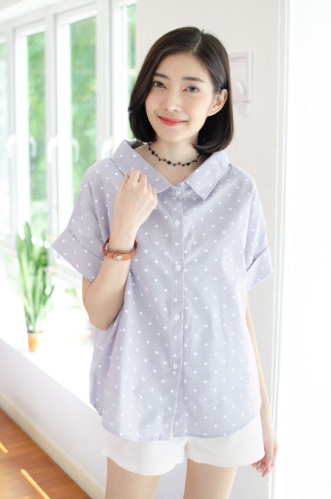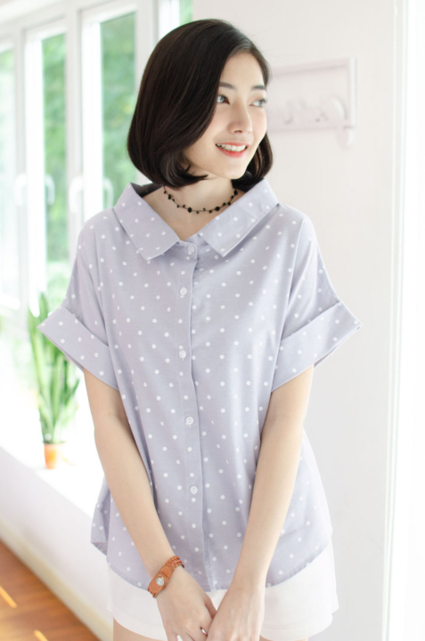 เสื้อเชิ้ตแขนล้ำ คอปก ผ่ากระดุมด้านหน้า เนื้อคอตตอนพิมพ์ลายจุดสีขาว ด้านหลังแต่งสาบผ่าสั้นๆมีกระดุมจริง 2 เม็ด ใส่พับแขน น่ารักๆค่า
