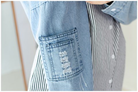 เสื้อเชิ้ต Oversized ผ้าคอตตอนลายริ้วสีดำ ตัดต่อกับผ้าเดนิม อย่างเก๋ แขนยาว มีความดีเทล เพิ่มกระเป๋าแต่งขาดช่วงแขน ใส่แล้วคูลมากมาย
