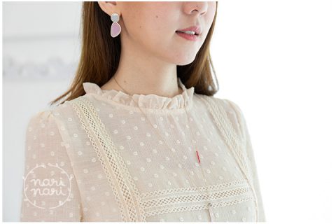 เสื้อคอปิดจับจีบตั้งๆ จั๊มปลายแขน ด้านหน้าแต่งแถบลูกไม้ เนื้อผ้าอัดลายย่นๆ แทรกริ้วดิ้นเงินเส้นบางๆ ทอมีลายดอกไม้เล็กนูนๆทั่วตัว ช่วงเอวต่อจีบรูด ระบายๆ ด้านหลังผ่าหยดน้ำติดกระดุมคอ ละมุนมากค่า