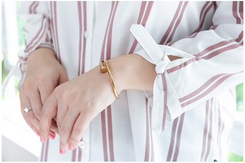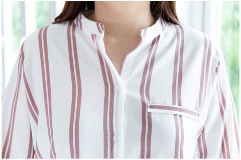เสื้อแขน 4 ส่วน ผ้าโพลีเอสเตอร์มีลายในตัว สีขาวพิมพ์ลายริ้วคู่ สีชมพู ผ่ากระดุมหน้า ปลายแขนแต่งแถบผูกเป็นโบว์ได้ ชายเสื้อโค้งหน่อยๆ สวยสบายๆค่า