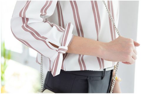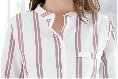 เสื้อแขน 4 ส่วน ผ้าโพลีเอสเตอร์มีลายในตัว สีขาวพิมพ์ลายริ้วคู่ สีชมพู ผ่ากระดุมหน้า ปลายแขนแต่งแถบผูกเป็นโบว์ได้ ชายเสื้อโค้งหน่อยๆ สวยสบายๆค่า