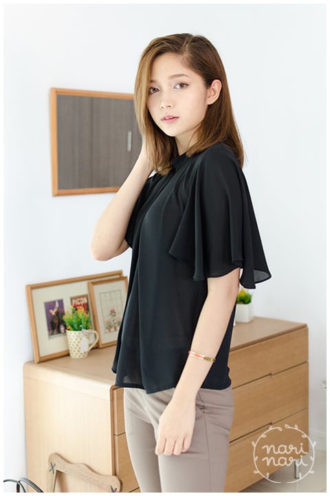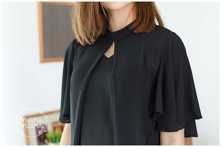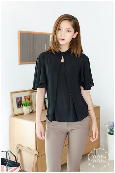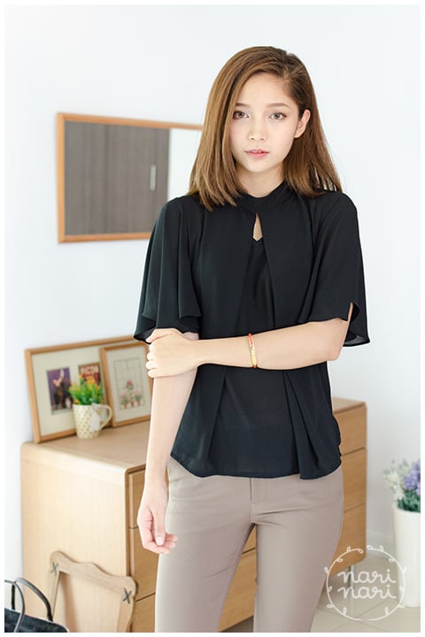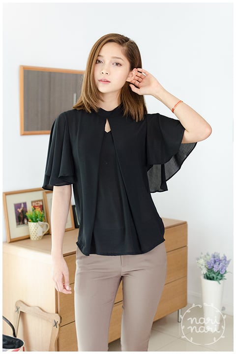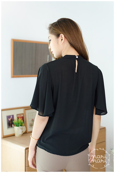 เสื้อสีดำ ผ้าชีน่าเนื้อสวย ละเอียดๆ เบาๆ คอปิด ด้านหน้าแต่งผ้าทบซ้อน แหวกด้านหน้า เปิดให้เป็นคอวีนิดๆ แขนระบายทรงผีเสื้อ เนื้อทิ้งๆ จังหวะสวย ด้านหลังเจาะหยดน้ำ ติดกระดุมคอ แค่ใส่ปล่อยๆ ก็สวยแล้วค่ะ