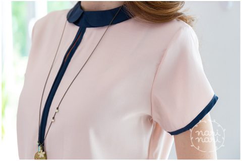 เสื้อคอตั้งๆแต่งปกบัวเล็ก ใต้ปกผ่าหยดน้ำแคบๆด้านหน้า ช่วงกลางเสื้อด้านหน้าและหลังแต่งแถบกุ๊นคู่ยาว ผ่าหยดน้ำติดกระดุมคอด้านหลัง ผ้าไหมอิตาลีใส่สบาย รีดง่ายมากค่า
