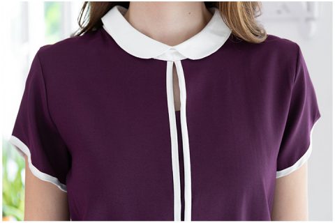 เสื้อคอตั้งๆแต่งปกบัวเล็ก ใต้ปกผ่าหยดน้ำแคบๆด้านหน้า ช่วงกลางเสื้อด้านหน้าและหลังแต่งแถบกุ๊นคู่ยาว ผ่าหยดน้ำติดกระดุมคอด้านหลัง ผ้าไหมอิตาลีใส่สบาย รีดง่ายมากค่า