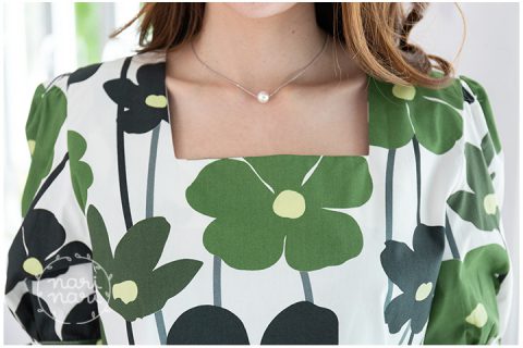 เสื้อคอตตอนดีไซน์คอเหลี่ยมๆ ทรง diamond cut น่าร้ากสุดๆ พิมพ์ลายดอกไม้ทั้งตัว เล่นโทนสีเขียว แขนตุ๊กตาปลายแขนมีสายไว้ผูกเป็นโบว์ ด้านหลังผ่าหยดน้ำติดกระดุม ใส่ทรงหลวมๆ ชิลเลย