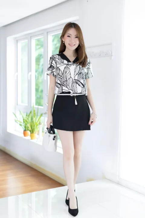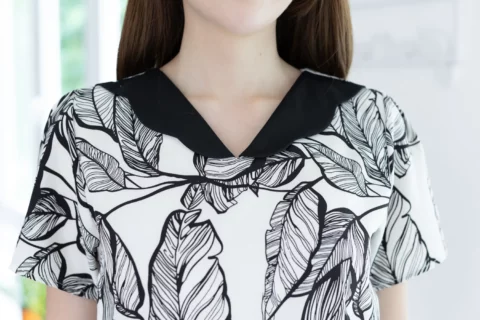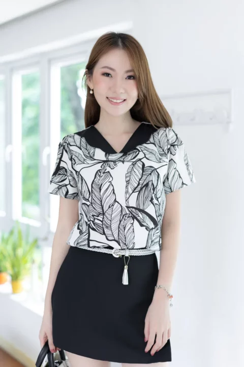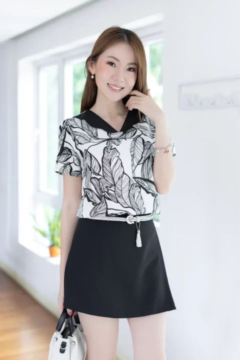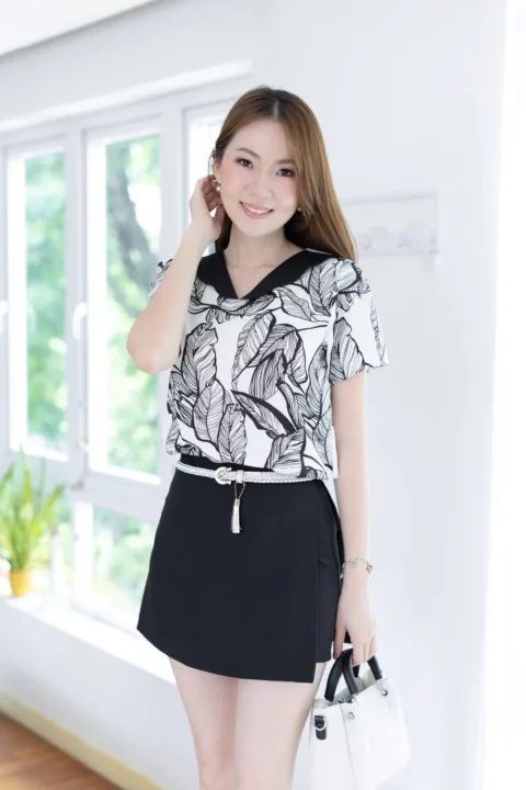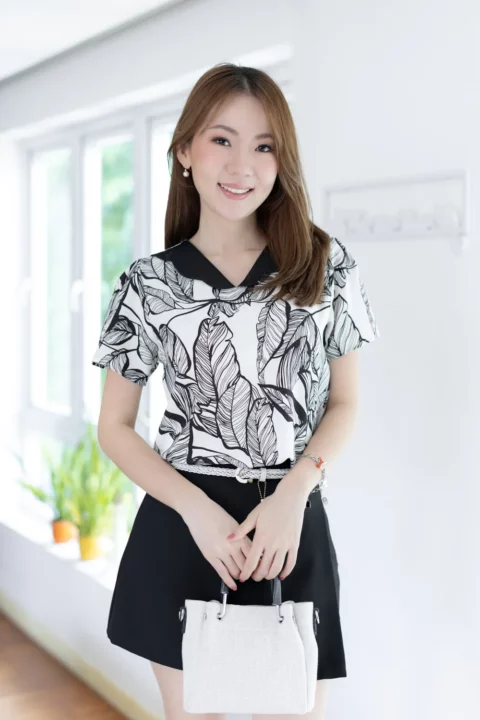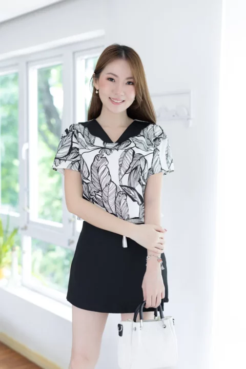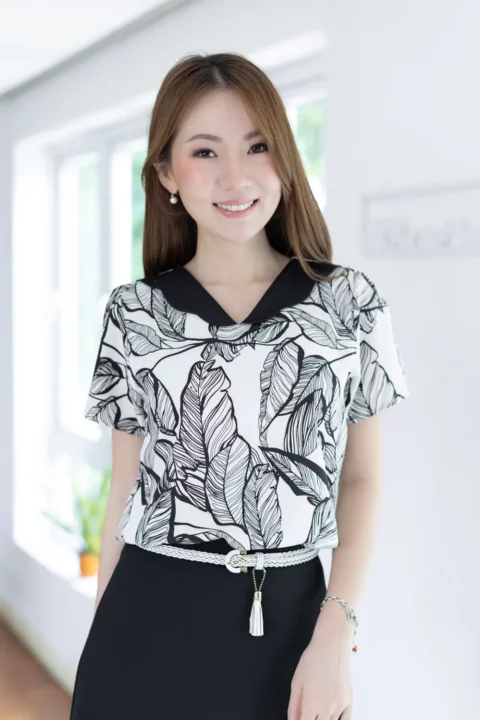 เสื้อคอวีแต่งปกขอบหยักโค้งๆ น่ารักอ่อนหวาน ขอบปกสีพื้น ตัวเสื้อพิมพ์ลายใบไม้ ด้านหลังผ่าหยดน้ำติดกระดุมคอ เนื้อผ้าดี๊ดี นิ่มลื่น ใส่สบายไม่ร้อน รีดง่ายมากด้วย