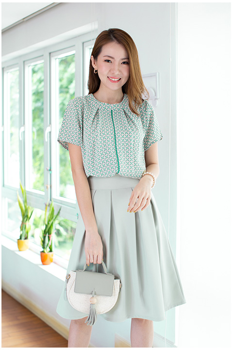 เสื้อแขนสั้นคอกลม จับจีบช่วงคอเบาๆ เนื้อผ้าโพลีเอสเตอร์ผสม พิมพ์ลายกราฟิกคู่สีน่ารัก เวรี่เรโทร แต่งตะเข็บกุ๊นแถบยาวด้านหน้า ด้านหลังผ่าซิปซ่อน ใส่ไปทำงานได้ สวยเก๋ ดูดี ใส่ได้ไม่เบื่อเลย