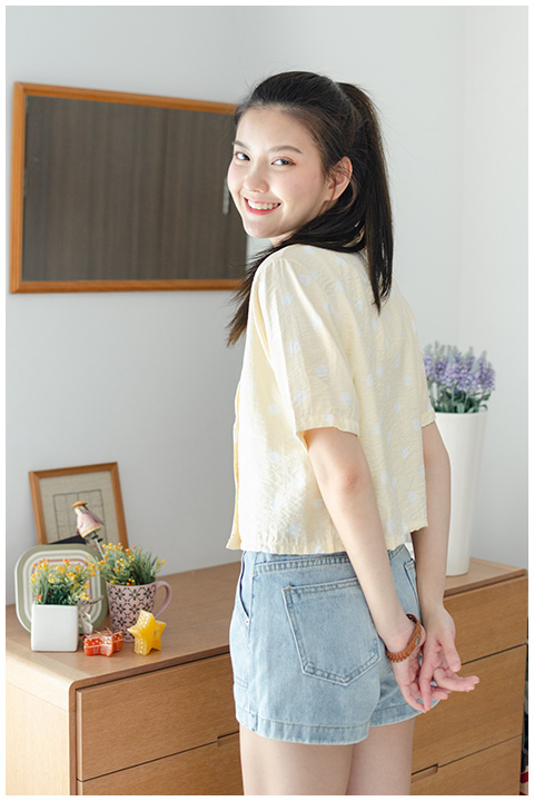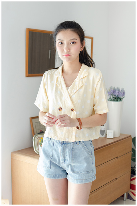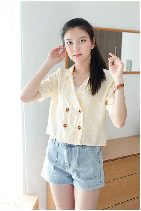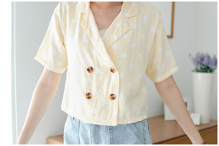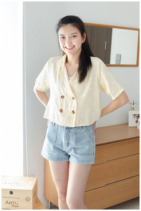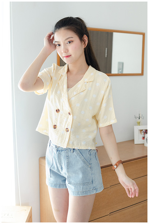 เสื้อลายจุด แขนสั้น คอวีแต่งปกเทเลอร์ ตัวเสื้อซ้อนด้านหน้าติดกระดุม 2 คู่ ตัดเย็บด้วยผ้าโพลีเอสเตอร์ผสม เนื้อนิ่ม ผ้าไม่บาง สีละมุนนนมากกกก ทรงครอปสั้นๆ น่ารักที่สุด