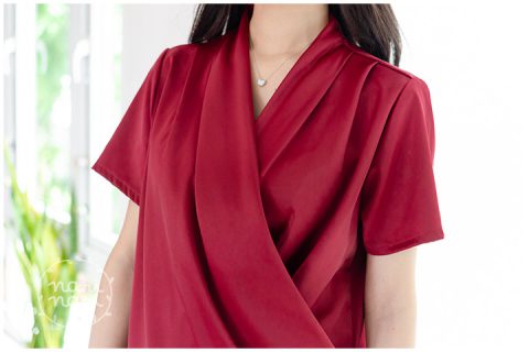 เสื้อสวย ทรงหรูหรา ตัดเย็บด้วยซาตินเนื้อหนาสีแดง Maroon ช่วงไหล่จับจีบ ไขว้ซ้อนกันด้านหน้า ทิ้งตัวจังหวะสวย รุ่นนี้ทรงแขนสั้นใส่ง่ายขึ้น ใส่ปล่อยได้ นุ่งทับก็งาม สวยมีคลาสค่า