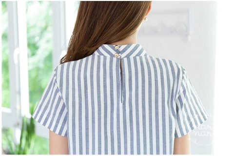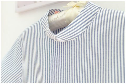 เสื้อดีไซน์คอตั้ง เล่นลายผ้าลายริ้วซ้อนสลับกันเป็นแนวเฉียง ชายเสื้อน่ารักๆ เก๋ๆ ด้านหลังเจาะหยดน้ำ ติดกระดุมคอ ใช้ผ้าคอตตอนอ็อกซ์ฟอร์ด เนื้อดี ใส่สวยค่า