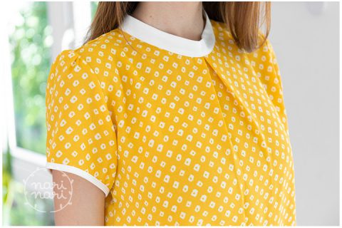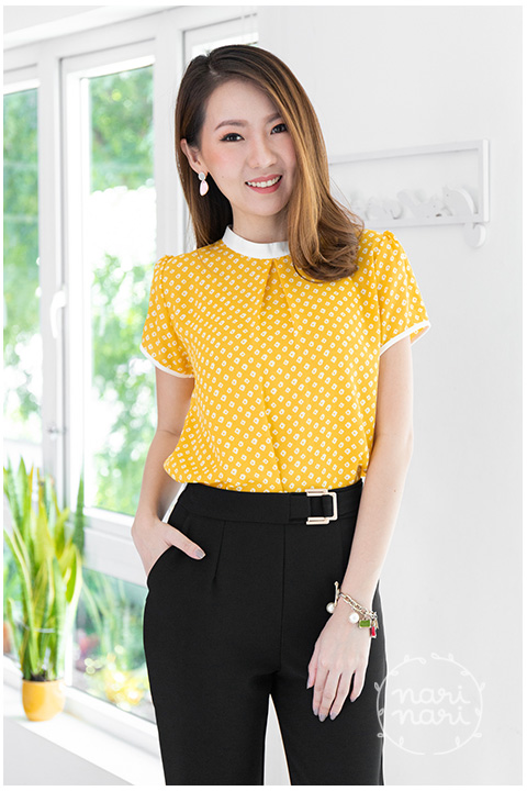 เสื้อสวย ผ้าชีฟองพิมพ์ลาย ลายคอตั้ง จับจีบทวิสตรงกลางอก แขนสั้น กุ๊นขอบสีเข้ากัน ด้านหลังผ่าหยดน้ำติดกระดุมคอ เนื้อผ้านิ่ม รีดง่ายด้วยค่า
