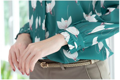 เสื้อเชิ้ตผ่าหน้าเนื้อชีน่างานคุณภาพ เนื้อผ้าเย็นๆทิ้งๆ มีน้ำหนัก รีดง่าย ทรงแขนยาวพิมพ์ลายดอกไม้ ช่วงคอและปลายแขนเสื้อแต่งระบายสั้น ผ่าปลายแขนติดกระดุม สาบด้านหน้าเป็นดีเทลตีเกล็ดถี่ยาวปิดกระดุม กระดุมเม็ดแรกเพิ่มกระดุมมุกเล็กๆใกล้คอ สวยงามลงตัว