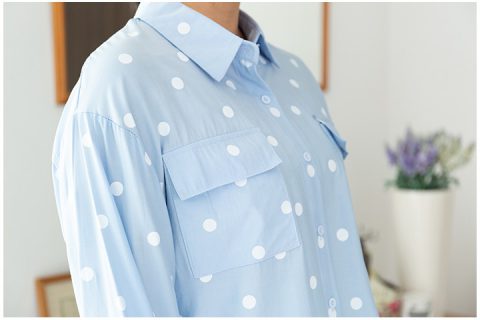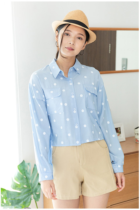 เสื้อครอปน่ารักๆ เนื้อผ้าสุดนิ่มมม เนื้อเนียนๆลื่นๆ พิมพ์ลายจุดสีขาว คอปกผ่าหน้า แต่งกระเป๋าจริง 2 ข้าง แขนยาว ใส่แบบไหล่ตกนิดๆ น่าร้ากกก