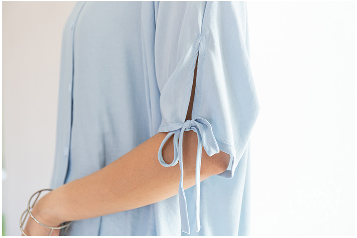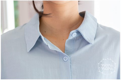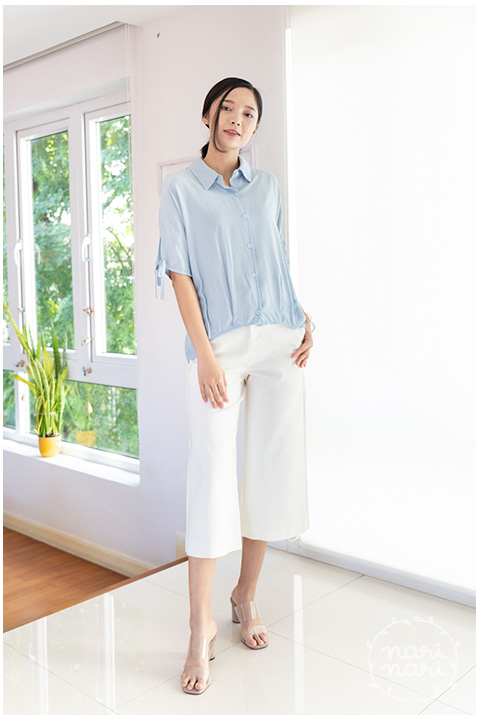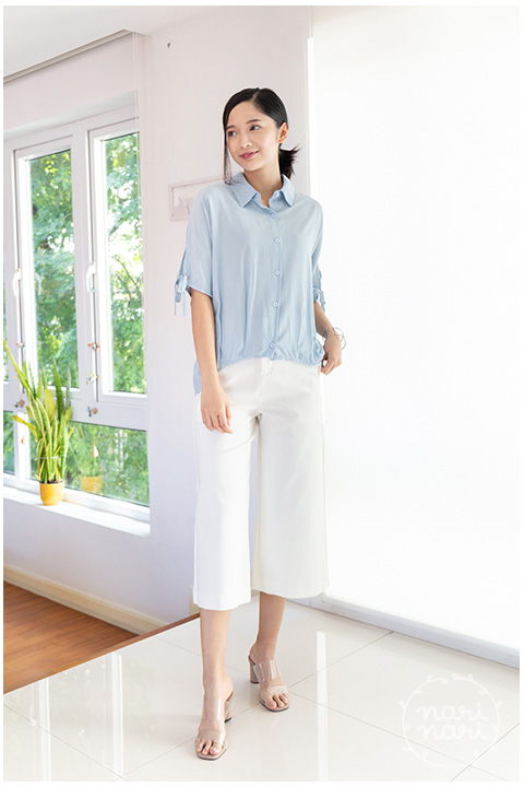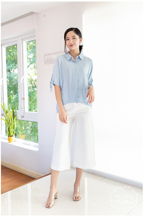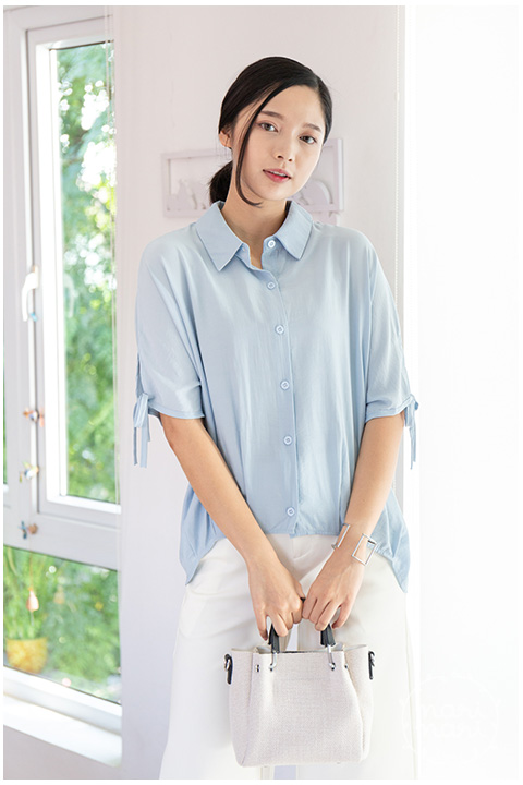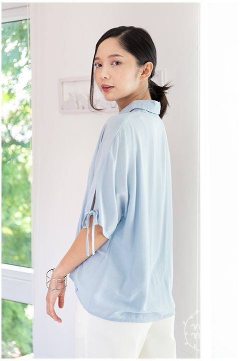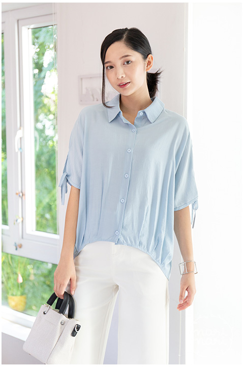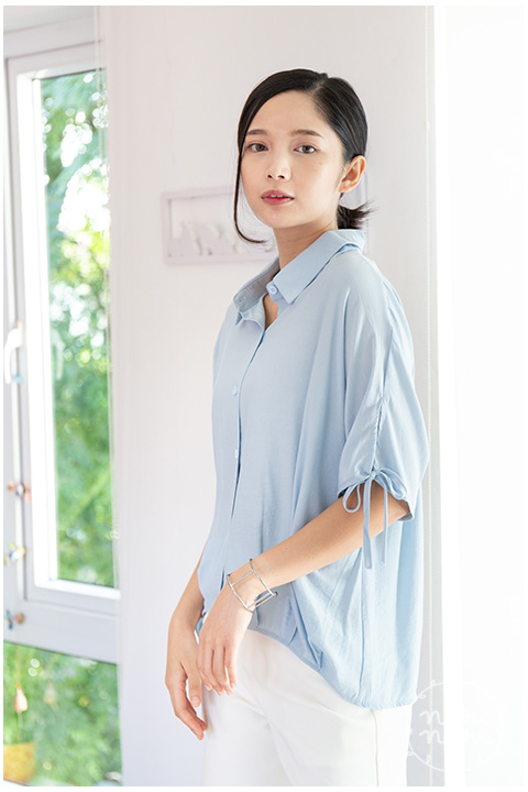 เสื้อเชิ้ตทรงกึ่งแขนค้างคาว คอปกผ่ากระดุมหน้า ปลายแขนเสื้อผ่าสั้นแต่งสายไว้ผูก ชายเสื้อจับจีบเข้าทรงพอดีเหนือสะโพก ด้านหลังยาวกว่าด้านหน้าเล็กน้อย ผ้าซิลค์ผสม เนื้อเย็น ฟีลชิลๆแอบย่นบางๆ เนื้อทิ้งนิดหน่อย ใส่แบบหลวม สบายมากเว่อ