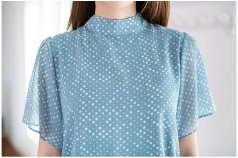เสื้อคอปิดทรงคุ้นเคยใส่ง่ายแมทช์ง่าย แต่ปรับผ้าเป็นเนื้อชีฟอง พิมพ์ลายจุด เนื้อชีฟองนิ่มรีดง่ายและดูแลง่าย เพิ่มซับในไว้ให้เพื่อความสะดวกในการแต่งตัวไม่ต้องใส่หลายชั้นก็เรียบร้อยเลย ด้านหลังผ่าหยดน้ำติดกระดุมคอ สวยงามมากมาย