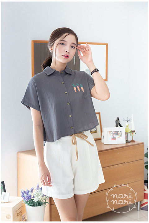 เสื้อเชิ้ตทรงสั้นสุดน่ารัก แขนล้ำๆ ใส่หลวมๆ ชิลเลยย มีลายแครอทปักคิ้วท์คูณ 3 เนื้อผ้าลินินผสม นิ่ม แต่ไม่บางมาก น่ารักอดใจไม่ไหววว