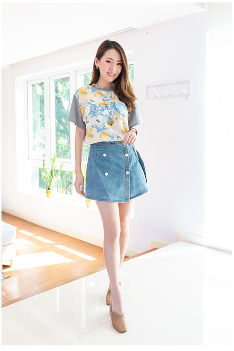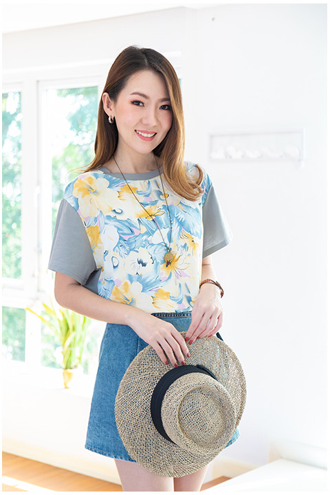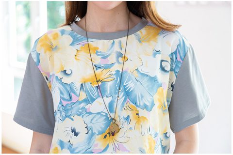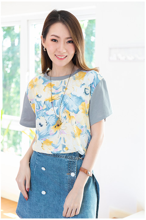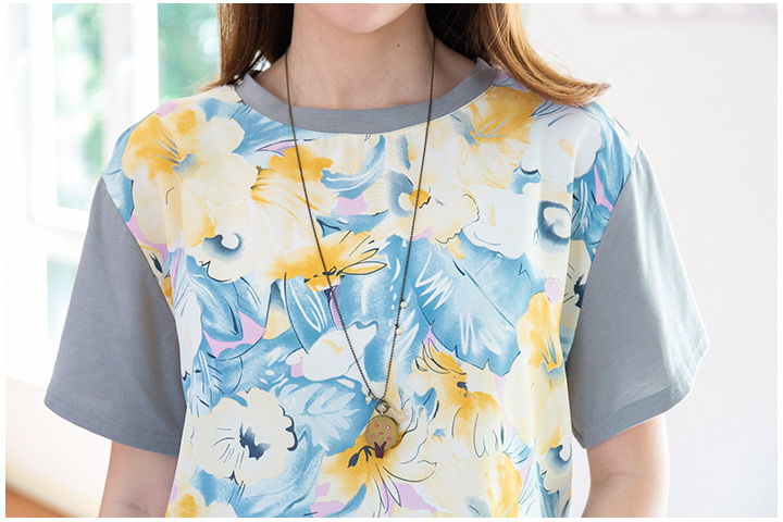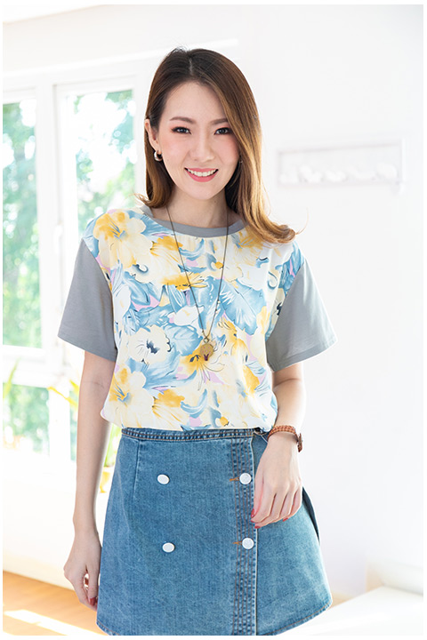 เสื้อคอกลม แขนสั้น เนื้อคอตตอนยืดนิ่มๆ ตัดต่อชิ้นหน้าด้วยโพลีเอสเตอร์ผสมพิมพ์ลายกราฟิกลายดอกไม้ฟุ้งๆ โทนเทา – เหลือง – น้ำเงิน ทรงนี้ใส่สบายไม่ร้อน ใส่หลวมๆ ทรงนี้ชิลเลยย