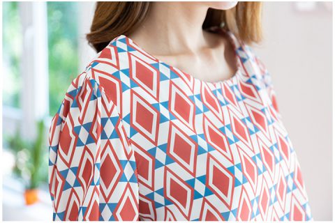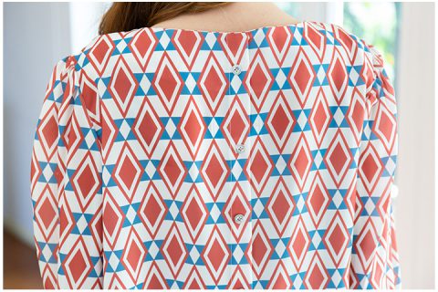 เสื้อลายสวยโดดเด่น กราฟิกเรขาคณิตสีแดง – ขาว – ฟ้าเข้ม เป็นคู่สีที่สนุกสนานมากค่า ทรงใส่สบายคอกลม แขนยาว ปลายแขนติดกระดุม แถบจะกว้างกว่าปกติดู Classy ด้านหลังแต่งสาบเสื้อยาวพร้อมกระดุมหลอก ผ้าเนื้อดี นิ่มลื่น รีดง่ายค่า