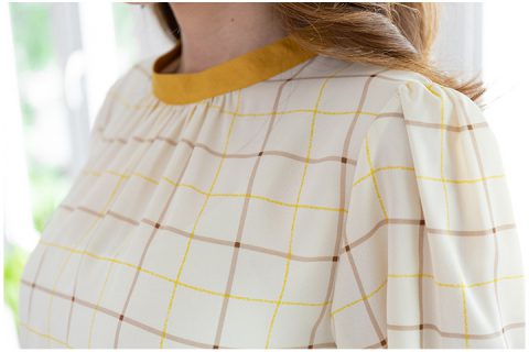 เสื้อทำงานทรงสวยหรู แขนยาวคอปิดตั้ง จีบรูดใต้คอ ด้านหลังผ่าหยดน้ำติดกระดุมคอ เนื้อชีฟองนิ่มลายตาราง ไม่ฉูดฉาดมากสีเหลืองอ่อนครีมๆ เป็นความนวลที่ถูกต้อง ทรงสุภาพ งานเรียบร้อยมากค่ะ