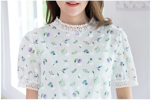 เสื้อครอปแต่งลูกไม้หวาน ใช้ผ้าโพลีเอสเตอร์ผสม เนื้อดี นิ่มลื่น ลายดอกไม้ คอปิดแต่งขอบลูกไม้ ผ่าซิปสั้นด้านหลัง และซิปซ่อนด้านข้างลำตัว แขนสั้น ชายเสื้อและปลายแขนเล่นเชิงลูกไม้สวยมาก แมตช์กับขอบคอ มีซับใน งานสวยหวานค่า