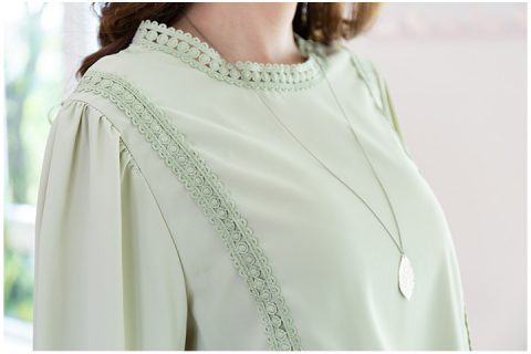เสื้อแขนยาว ผ้าสีเขียวพิซตาชิโอ หวานๆนวลๆ แต่งรอบคอด้วยลูกไม้ แขนยาว ติดกระดุมปลายแขนเสื้อ ผ่าหยดน้ำด้านหลังคอ แต่งแถบลูกไม้ยาวฉลุลายสวย 2 เส้นด้านหน้า ใช้ผ้าโพลีเอสเตอร์เนื้อดี ทิ้งนิดๆ สัมผัสเนี๊ยนเนียน ใส่สบายค่ะ
