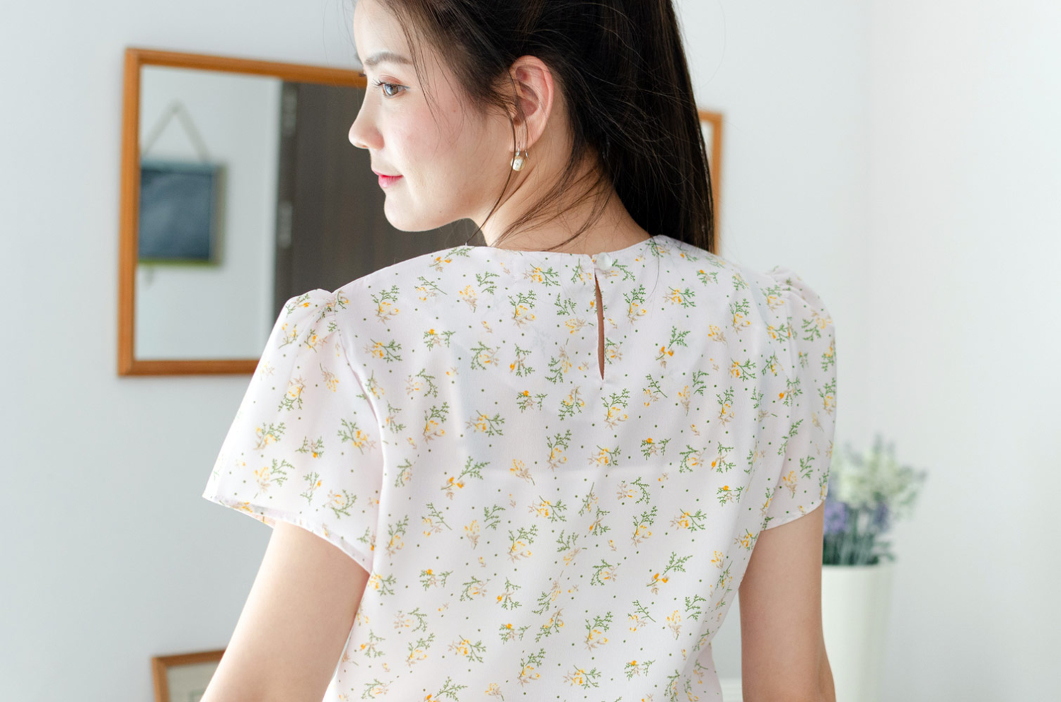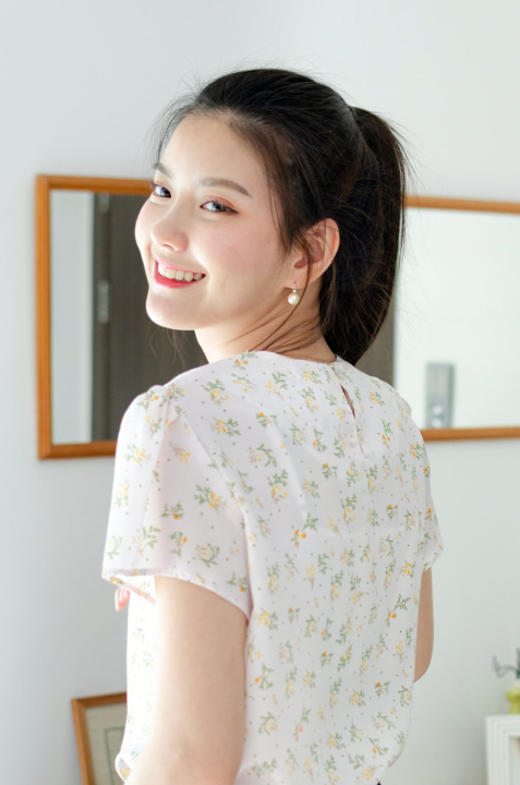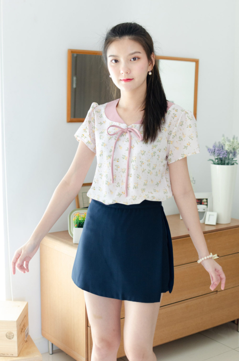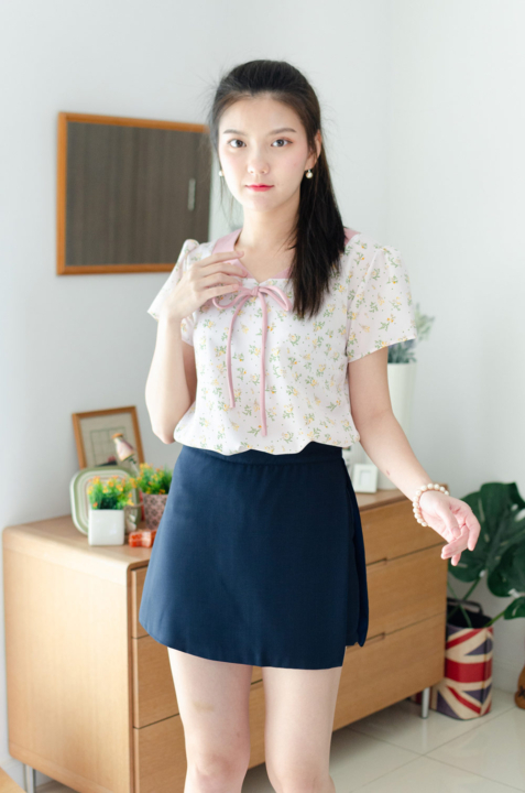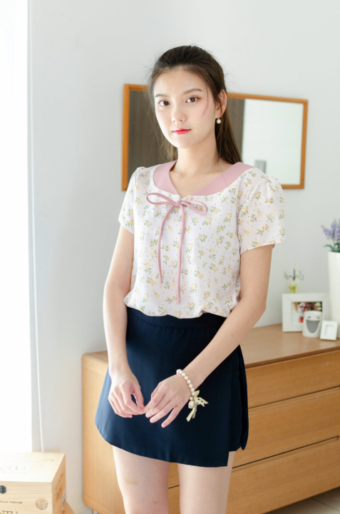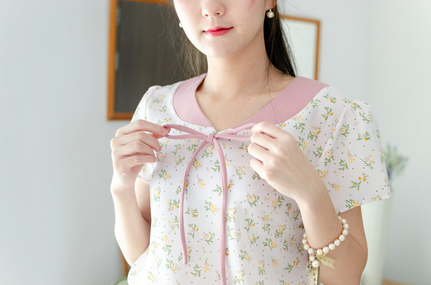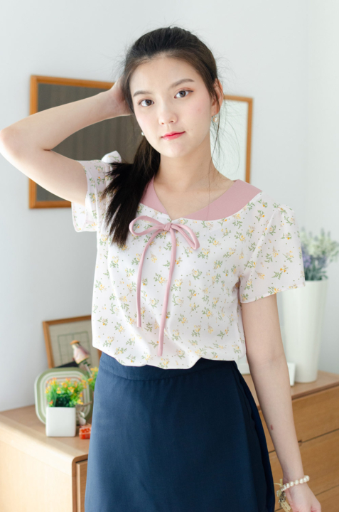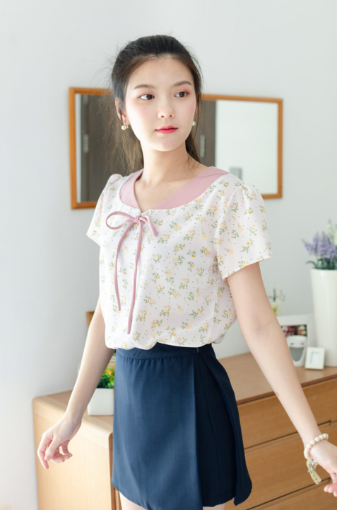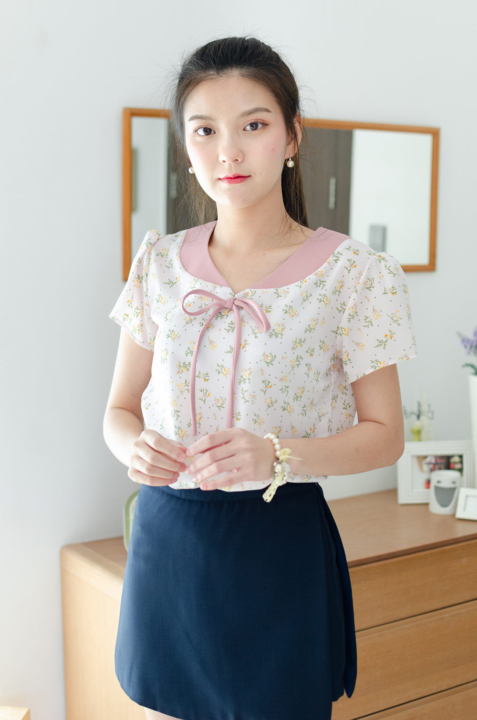เสื้อไหมสปัน เนื้อนิ่ม สีสวยหวาน คอกลมแต่งด้วยผ้าจอร์เจียเป็นแถบโค้ง เพิ่มความหวานด้วยสายเย็บฟิกซ์ไว้ผูกโบว์ด้านหน้า ด้านหลังผ่าหยดน้ำติดกระดุมคอ รุ่นนี้พิมพ์ลายดอกไม้หวานๆ น่ารักมากเลยยย