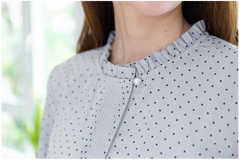 เสื้อเชิ้ตผ่าหน้าเนื้อชีน่างานคุณภาพ เนื้อผ้าเย็นๆ ทิ้งๆ มีน้ำหนัก รีดง่าย ทรงแขนยาวพิมพ์ลายจุดดำเล็กๆ ช่วงคอและปลายแขนเสื้อแต่งระบายสั้น ผ่าปลายแขนติดกระดุม สาบด้านหน้าเป็นดีเทลตีเกล็ดถี่ยาวปิดกระดุม กระดุมเม็ดแรกเพิ่มกระดุมมุกเล็กๆ ใกล้คอ สวยงามลงตัว ใส่ได้บ่อย คลาสสิกสุดๆ