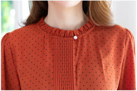 เสื้อเชิ้ตผ่าหน้าเนื้อชีน่างานคุณภาพ เนื้อผ้าเย็นๆ ทิ้งๆ มีน้ำหนัก รีดง่าย ทรงแขนยาวพิมพ์ลายจุดดำเล็กๆ ช่วงคอและปลายแขนเสื้อแต่งระบายสั้น ผ่าปลายแขนติดกระดุม สาบด้านหน้าเป็นดีเทลตีเกล็ดถี่ยาวปิดกระดุม กระดุมเม็ดแรกเพิ่มกระดุมมุกเล็กๆ ใกล้คอ สวยงามลงตัว ใส่ได้บ่อย คลาสสิกสุดๆ