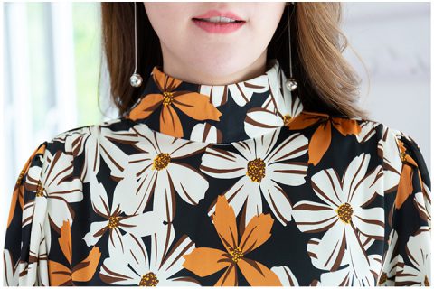เสื้อคอปิด แขนยาวติดกระดุมปลายแขน ช่วงไหล่จับจีบเบาๆ รุ่นนี้เป็นเนื้อซาตินแบบไม่หนามาก ผิวเงา สัมผัสลื่นๆเย็นๆใส่แล้วทิ้งตัว ผ้าพิมพ์ลายดอกไม้สีครีม – ส้ม รีดง่าย ตัวเสื้อผ่าซิปซ่อนด้านหลัง เสื้อทรงสุภาพ Classy มากมาย