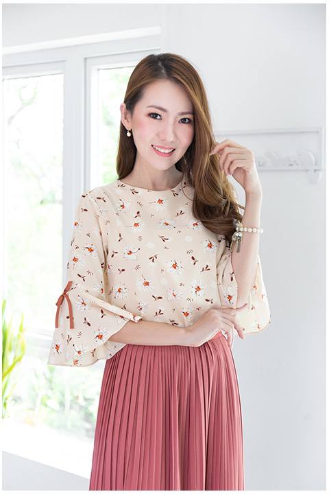 เสื้อทำงานสวยสุภาพ พิมพ์ลายดอกไม้ขาวบนพื้นสีครีม เนื้อผ้านิ่มมม ใส่สบายที่สุด รีดง่ายเหมือนเดิมเลย ด้านหลังผ่าหยดน้ำติดกระดุม มีต่อปลายแขนทรงกระดิ่งบานออก แต่งสายเย็บฟิกซ์ไว้ผูกโบว์ หวานสวยค่ะ