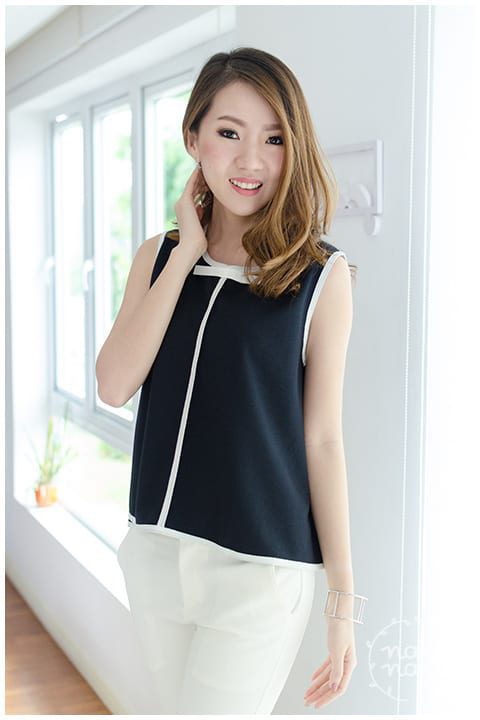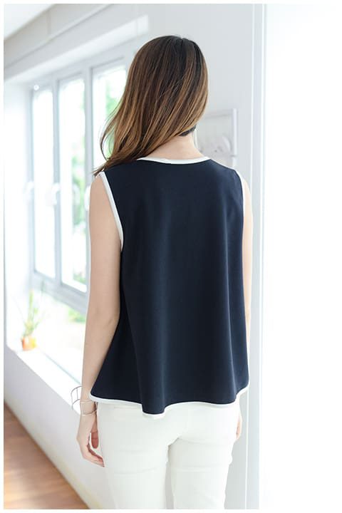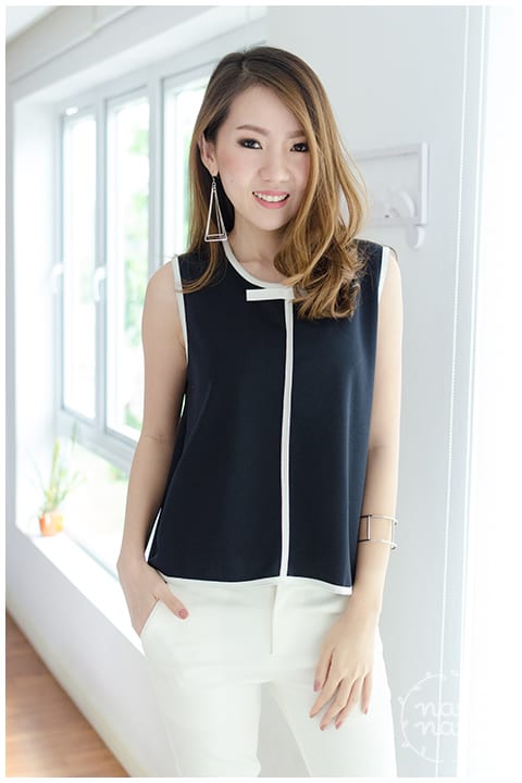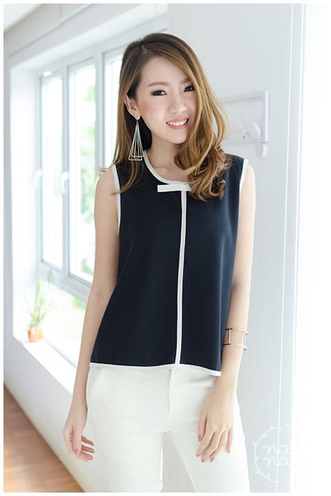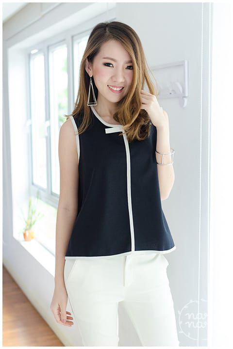 เสื้อแขนกุด สีกรมท่าเข้ม คล้ายดำ คอกลม กุ๊นขอบสีขาวรอบคอ แขน และชายเสื้อ แต่งกุ๊นขาวด้านหน้าด้วย พร้อมโบว์เล็กๆ ตรงคอ ดีไซน์ชายเสื้อเป็นทรงเอ ระบายพลิ้วพองาม ผ้าโพลีเอสเตอร์ใส่ง่าย รีดง่ายค่ะ