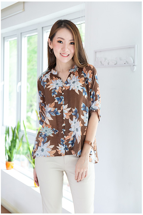 เสื้อรุ่นนี้แนะนำมากๆสำหรับคนที่รักงานที่ดูเป็นธรรมชาติ เพราะตัดเย็บด้วยผ้าคอตตอนผสมเนื้อเบาทอแบบมีลายคล้ายเปลือกไม้ในตัว พื้นสีน้ำตาลอุ่นๆพิมพ์ลายดอกไม้เฉดสีสวยงาม ทรงแขนแบบ Raglan ตีตะเข็บเฉียง ผ่ากระดุมด้านหน้าเรียงกระดุมยาวถี่ๆดูเก๋ ใช้กระดุมเปลือกหอยมุกล้อแสงเบาๆ ฟรีไซส์ทรงปล่อยๆ ใส่เป็นเสื้อคลุมก็ได้เหมาะกับหน้าร้อนมากเลย