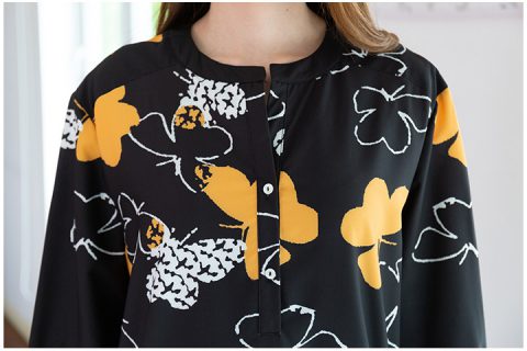 เสื้อผ้าโพลีเอสเตอร์เนื้อดีมาก นิ่ม เย็น ทิ้งนิดๆ ผิวเนียน ที่สำคัญไม่โปร่งแสงค่า ทรงคอจีน ผ่ากระดุมหน้าสั้นๆ พื้นดำแต่ใส่ได้ดูสดใสๆเพราะพิมพ์ลายผีเสื้อสีเหลือง อารมณ์ดี ทรงสบาย ใส่ยังไงก็สวยคลาสสิค