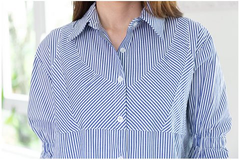 เชิ้ตสวยเน้นดีเทลสนุกๆ ใช้ผ้าคอตตอนทอลายริ้ว ผ่ากระดุมหน้ายาว แต่งดีเทลช่วงอกด้วยการวางผ้าตัดลายเฉียง แขนเสื้อยาว จั๊มยางยืด 2 จังหวะ มู้ดเลดี้ๆ ชายเสื้อโค้งผ่าข้างสูง ใส่ปล่อยสวยที่สุด เปรี้ยวเก๋ได้แม้จะใส่เชิ้ตตัวยาว