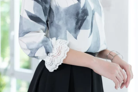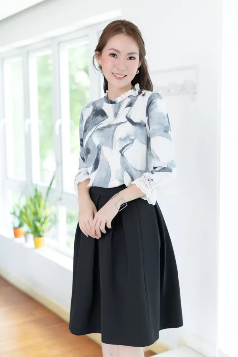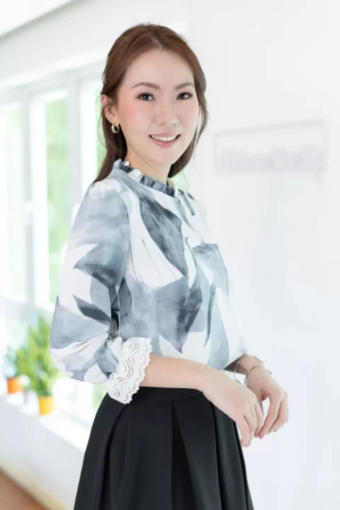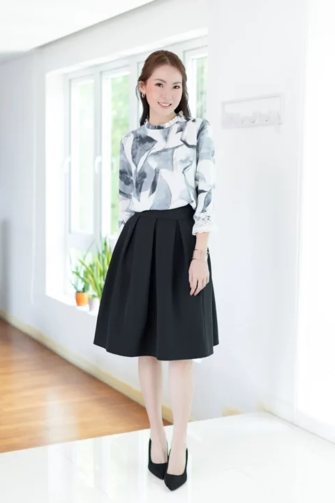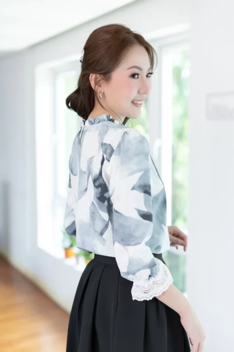 เสื้อคอกลมจับจีบตั้งๆรอบคอ ใช้ผ้าไหมอิตาลีผิวเนียนเรียบ ด้านหลังผ่าหยดน้ำติดกระดุม ปลายแขนแต่งลูกไม้เนื้อนิ่ม จั๊มยางยืดเป็นระบายดูหวาน เสื้อสวย ได้ลุคสุภาพ เน้นความคลาสซี่