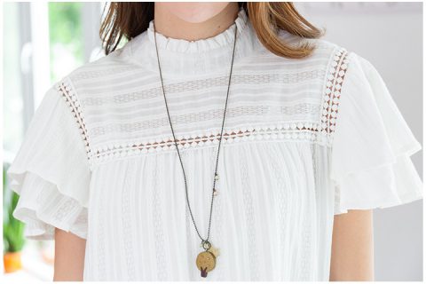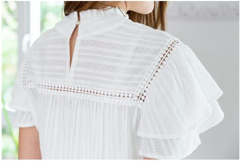 เสื้อคอตตอนเนื้อดี ผ้าทอมีลายในตัวสวยมีเอกลักษณ์ คอปิดแต่งจีบรอบคอ แขนสั้นทรงกระดิ่งซ้อน 2 ชั้น ช่วงหน้าอกแต่งแถบลูกไม้มีจีบรูด ชายเสื้อบานออก ด้านหลังผ่าหยดน้ำติดกระดุมคอ รุ่นนี้มีทั้งแถบลูกไม้และผ้าคอตตอน Texture สวย ตัวเสื้อไม่ยาวเกินไปใส่ปล่อยชายเสื้อได้หวานๆเลยค่า