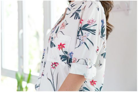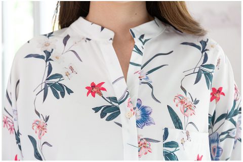 เสื้อคอจีนผ้าโพลีเอสเตอร์เนื้อดีมากๆ นิ่มลื่น ทิ้งตัวมีน้ำหนัก สีขาวพิมพ์ลายดอกไม้ ผ่ากระดุมหน้ายาว มีกระเป๋าจริง แขนยาวทรงแขนค้างคาวใส่สบายไม่อึดอัด ติดกระดุมปลายแขน มีสายกระดุมไว้พับแขนได้ ชายเสื้อโค้งทรงเสื้อยาว ใส่คลุมสะโพกสวยลงตัว