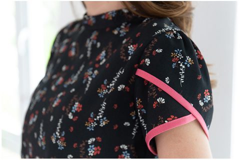 เสื้อสีดำสุดจะเก๋ คอปิดตั้ง เนื้อไหมสปันเย็นๆนิ่มๆพิมพ์ลายดอกไม้เล็กๆ ไม่หนา และไม่โปร่งแสงมาก กุ๊นขอบแขนตัดสีด้วยผ้าพื้นสีชมพูเข้ม สวยโดดเด่น