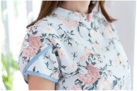 เสื้อสีฟ้าสุดจะเก๋ คอปิดตั้ง เนื้อโพลีเอสเตอร์ผสมนิ่มๆ พิมพ์ลายดอกไม้คลาสสิคสวยแบบเรโทรนิดๆ แขนสั้นซ้อนทรงกลีบบัว กุ๊นขอบแขนด้วยผ้าพื้น ใส่ไปทำงานได้หวานๆ เลย