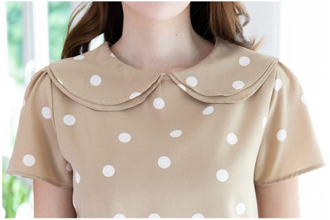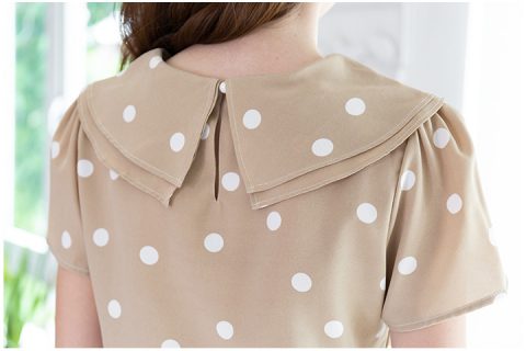 เสื้อทำงานลายจุด รุ่นนี้รับประกันความสวยความนวล ทรงเรียบๆลุคคลีนๆ คอกลม แต่งปกบัวซ้อน 2 ชั้น เจาะหยดน้ำติดกระดุมหลังคอ แขนสั้น ผ้านิ่ม รีดง่ายแห้งไว หวานเบาๆแบบแมทช์ง่าย โทนสีน้ำตาลกาแฟแบบนี้สวยม๊ากกเลย