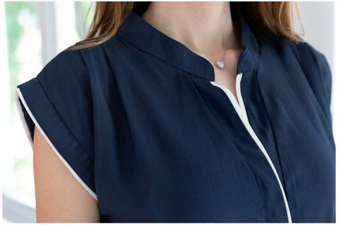 เสื้อคอจีนเนื้อนิ่มม ผ้าไม่หนามากแต่ไม่โปร่งแสง คอเสื้อแต่งสาบซ้อน เดินเส้นขอบขาว หัวไหล่จับจีบ ทรงแขนกุดแบบไม่เว้า ไม่โป๊ ใส่ง่ายๆทรงสบายๆ