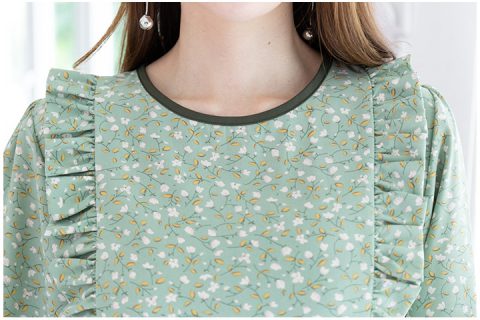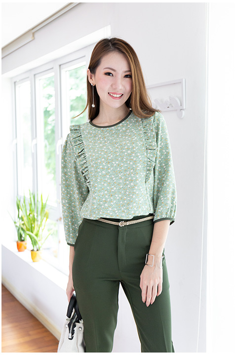 เสื้อทำงานเนื้อผ้าอิตาลีเนื้อดี นิ่มมม สีเขียวนวลตา พิมพ์ลายดอกไม้เล็กๆทั่วตัว คอกลม เจาะหยดน้ำหลังสวมใส่ง่าย ด้านหน้าตีเกล็ดข้างแต่งระบายสั้นๆ แขนยาวคลุมศอก ผ้าไม่โปร่งแสงมาก ชอบเลยย