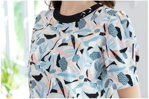 เสื้อลายกราฟิกเก๋ไก๋ ด้านหน้าแต่งขอบคอกลมสีพื้น ประดับกระดุมปั๊มลาย 2 เม็ด เจาะกระดุมหลังคอ ตัวเสื้อเป็นผ้าอิตาลีเนื้อดี นิ่มเนียน ผ้าดี ไม่โปร่งแสงมาก คอนเฟิร์มว่าใส่สบายที่สุด
