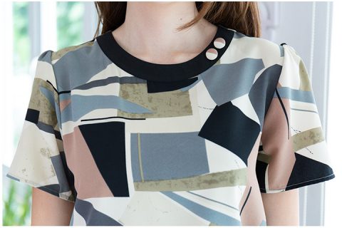 เสื้อลายกราฟิกเก๋ไก๋ ด้านหน้าแต่งขอบคอกลมสีพื้น ประดับกระดุมปั๊มลาย 2 เม็ด เจาะกระดุมหลังคอ ตัวเสื้อเป็นผ้าอิตาลีเนื้อดี นิ่มเนียน ผ้าดี ไม่โปร่งแสงมาก คอนเฟิร์มว่าใส่สบายที่สุด