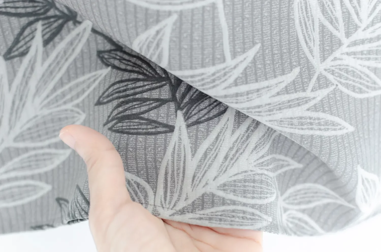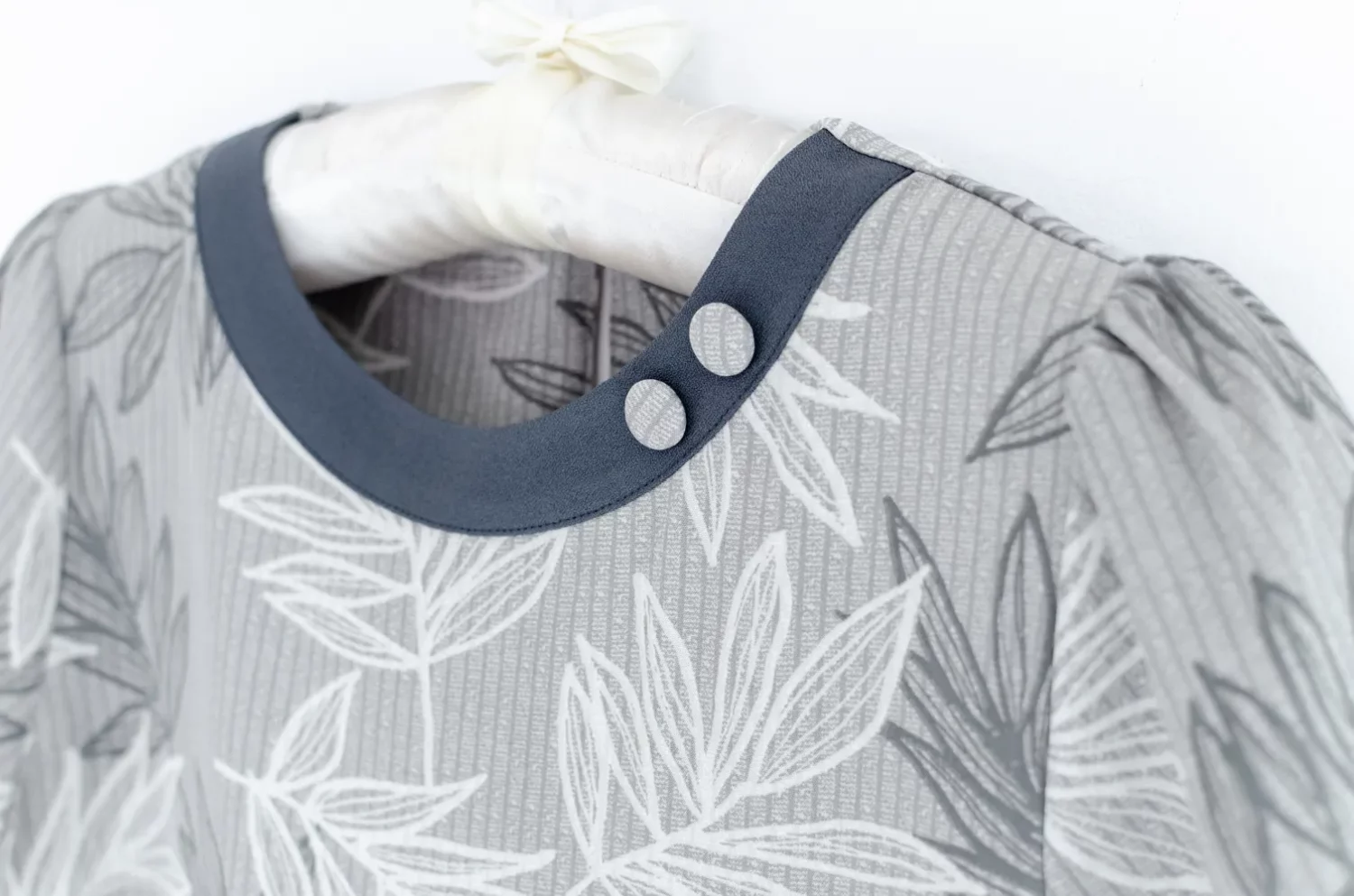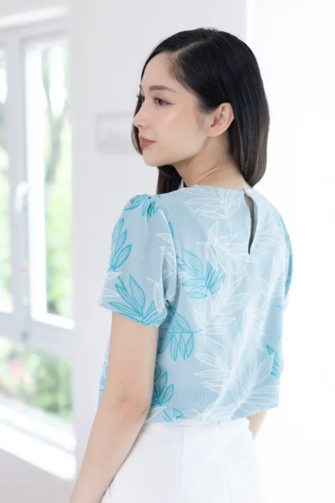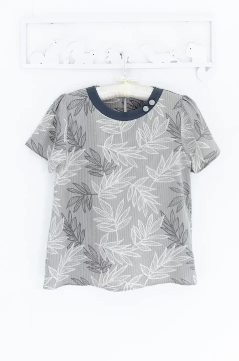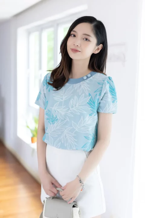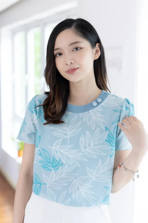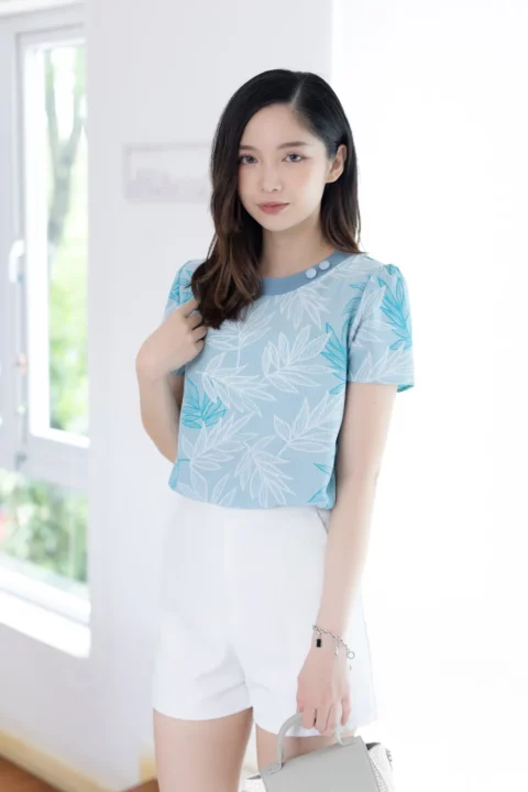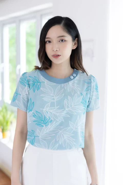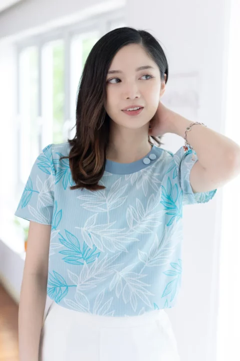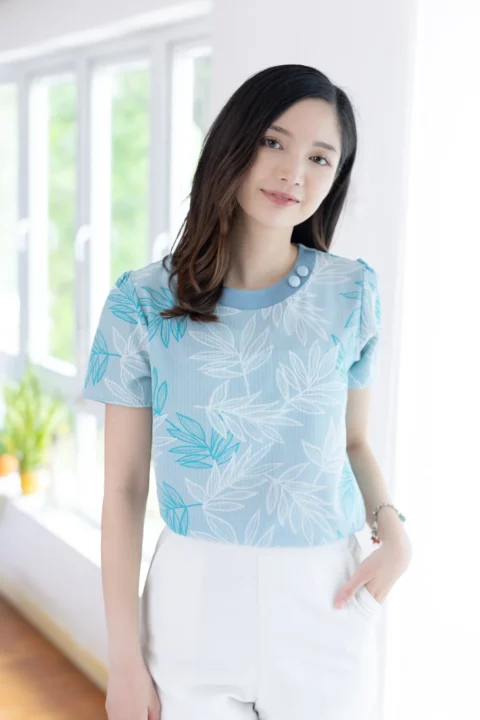 เสื้อลายใบไม้เก๋ๆ ด้านหน้าแต่งขอบคอกลมสีพื้น ประดับกระดุมปั๊มลาย 2 เม็ด เจาะหยดน้ำติดกระดุมหลังคอ ตัวเสื้อเป็นผ้าเนื้อดี นิ่มเนียน คอนเฟิร์มว่าใส่สบายที่สุด