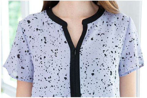 เสื้อทำงานคอจีน แต่งแถบดำช่วงคอและด้านหน้า ผ่าวีติดซิปซ่อนถึงกลางตัว ใช้ผ้าพิมพ์ลายกราฟิกเนื้อดี ไม่บางมากด้วยค่ะ ทรงและลายจับคู่กับกระโปรงหรือกางเกงง่าย ได้ลุคสวย Classy ค่า